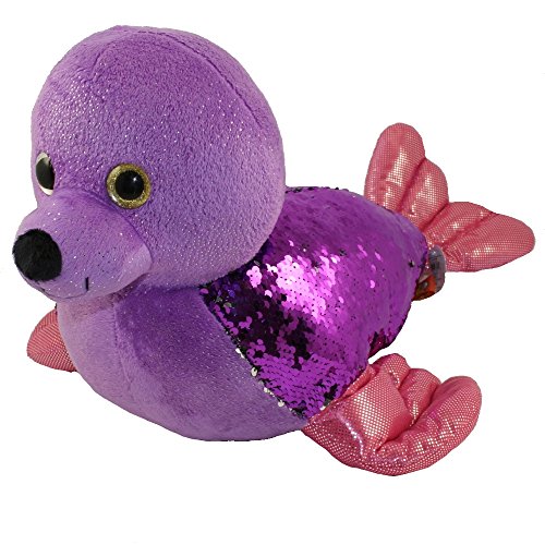 - PURPLE & SILVER SEAL PLUSH - This cute seal with its black and gold rimmed eyes has reversible mermaid sequins on top. The underneath of its body and the face are made from a soft cuddly purple fabric spinkled with silver litter. The seal's flippers are a sparkly pink fabric with silver pin dots. Its sparkle is sure to appeal to all ages!